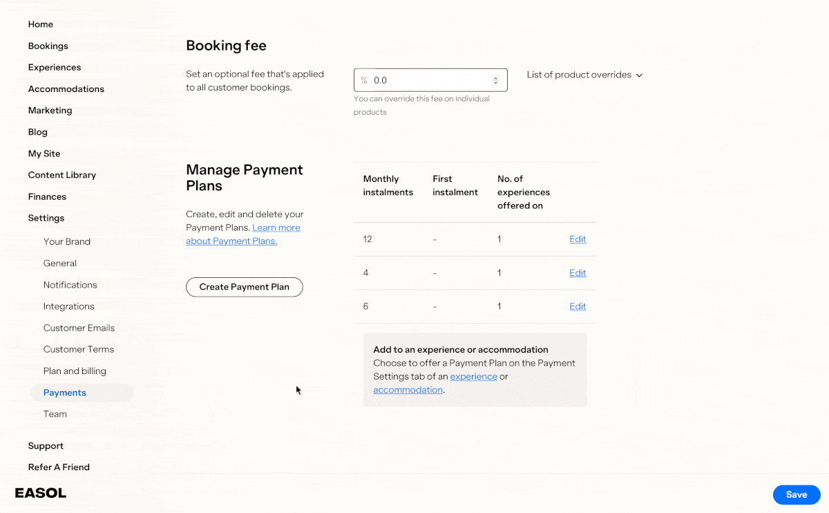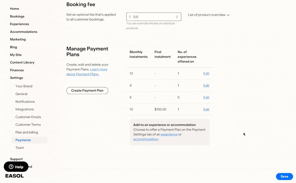 Always have the right payment plan option on offer by going back and editing the settings in the run up to your experience. You can edit the number of monthly instalments as well as the first instalment amount. Any edits will affect future bookings only.