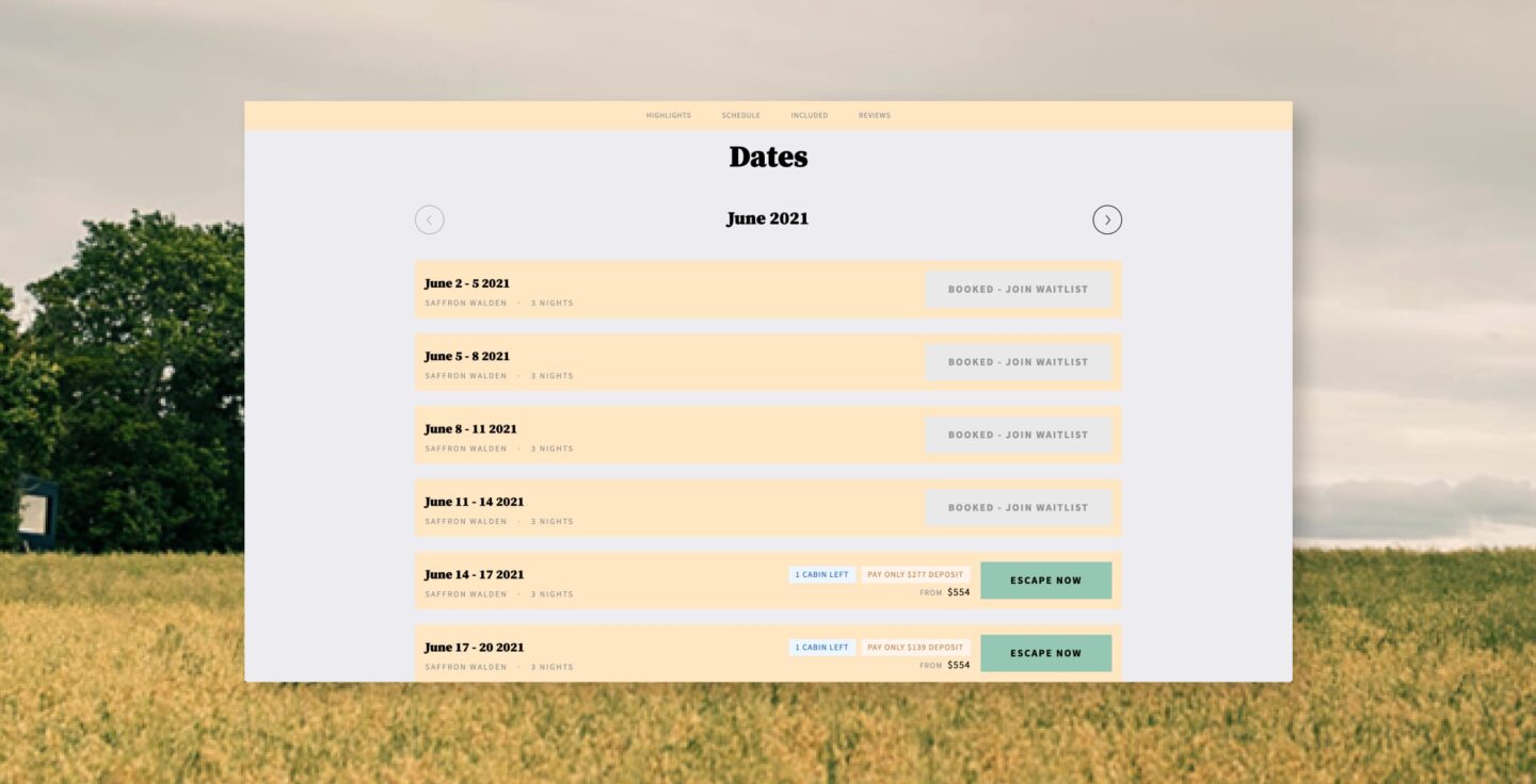For example, instead of a calendar that doesn’t create a sense of scarcity, Easol displays accommodations in blocks clearly marked with “Sold Out” or “X Cabins Left”. This prompts urgency has helped Unplugged convert potential customers into paying guests.