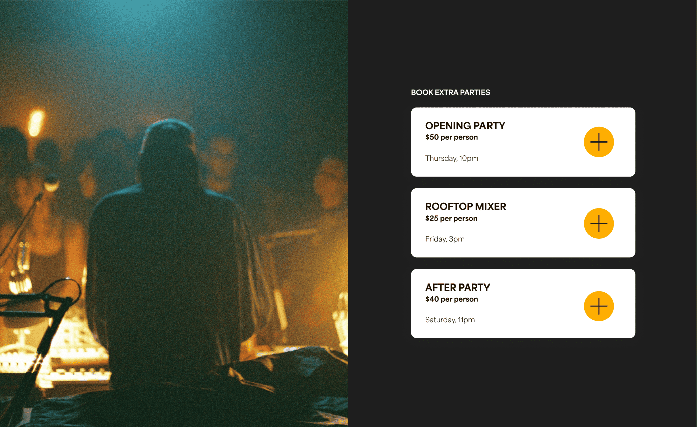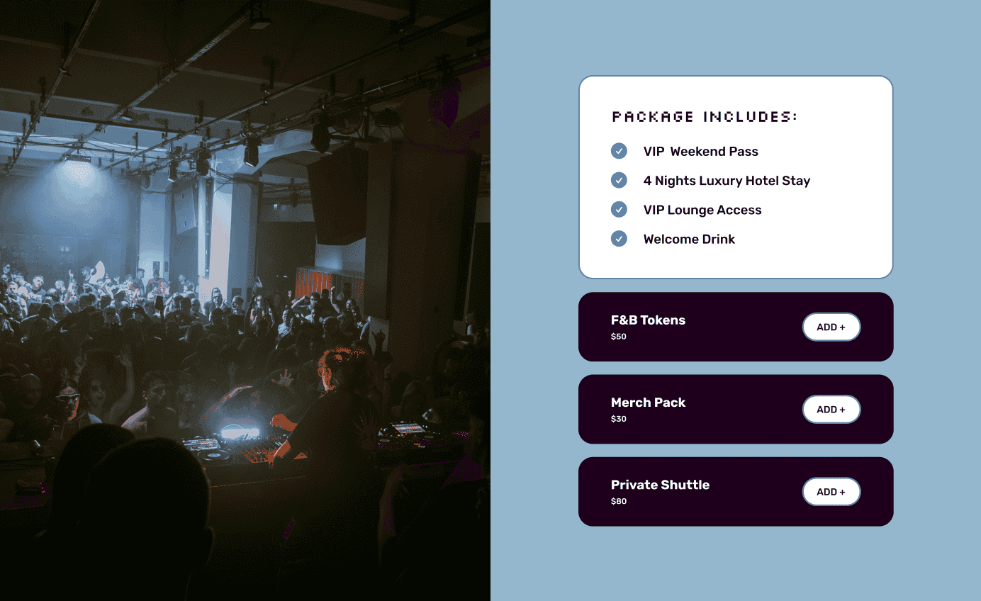 Increase profits through new revenue streams. Sell tickets, bundles, VIP, merch, upsells and more.